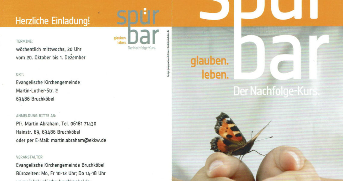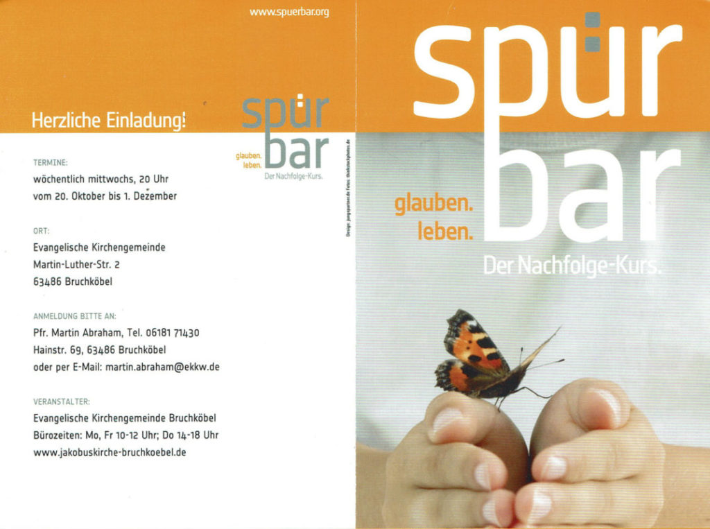 Vom 20. Oktober bis 1. Dezember laden wir jeweils mittwochs ein zum Glaubenskurs „spürbar“ – 20 Uhr im Gemeindehaus. Informationen und Anmeldemöglichkeiten entnehmen Sie bitte dem Flyer. Zurück zur Seite der Jakobuskirche