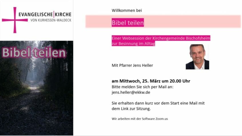 Wir möchten gerne eine Möglichkeit schaffen, gemeinsam über einen biblischen Text nachzudenken und dabei ins Gespräch zu kommen. Das gelingt auf einem digitalen Wege. Wenn Sie das mit uns erleben und ausprobieren wollen, schicken Sie mir bitte eine Mail als Anmeldung. Ich benötige Ihre Mailadresse, um Ihnen dann vor der Sitzung einen Link zu schicken, mit dem Sie an der Sitzung teilnehmen können. Die Mailadressen werde für keine weiteren Zwecke verwendet und auch nicht an Dritte weitergegeben.