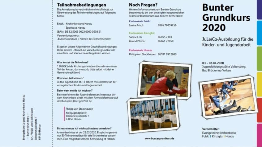Der „Bunte Grundkurs Kinder- und Jugendarbeit“ ist eine Schulung für alle Ehrenamtlichen, die in ihrer Kirchengemeinde mit Kindern und / oder Jugendlichen arbeiten. In Theorie und Praxis werden Ehrenamtliche für ihre Aufgabe in der Kirchengemeinde fit gemacht: Entwicklung von Kindern und Jugendlichen, Spielpädagogik, Rhetorik, Aufsichtspflicht, Gruppendynamik sind nur einige der Themen, die während des Kurses behandelt werden. Der Bunte Grundkurs ist für den Erhalt der „JugendleiterCard“ anerkannt (mehr Infos dazu unter www.juleica.de). Über die dafür verpflichtenden Inhalte hinaus gibt es weitere Angebote, die speziell auf die Arbeit im kirchlichen Bereich zugeschnitten sind.