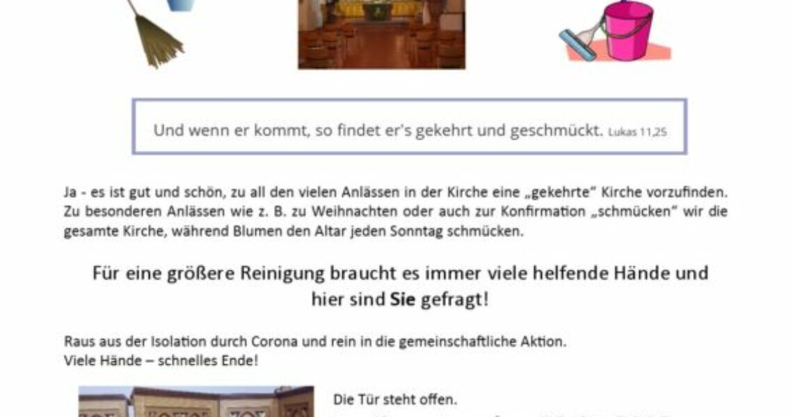 Es sind schon wieder fünf Jahre seit der letzten größeren Reinigung unserer Kirche vergangen. Wie in jeder Wohnung muss von Zeit zu Zeit einmal mehr gereinigt werden als bei den ...