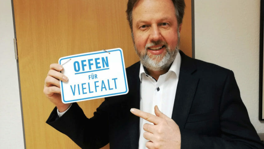 … und zeigt als Erster im Kirchenkreis das Türschild der Initiative „Offen für Vielfalt – Geschlossen gegen Ausgrenzung“. Er sagt dazu: „Offenheit heißt für uns, den Nächsten zu sehen – unabhängig von Geschlecht, Ethnie, sozialem Stand oder Religionszugehörigkeit“. Der Dekan sieht die Initiative als eine konsequente Weiterentwicklung der Hanauer Erklärung von 2018 „Zusammen in Vielfalt glauben“.