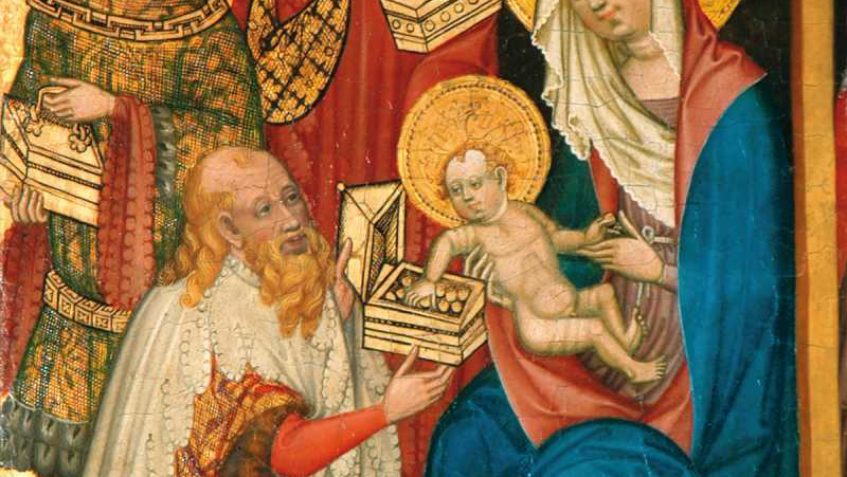 Bei Krippenspielen, aber auch in Darstellungen früherer Jahrhunderte sind die drei Könige ein Muss, bis hin zu einem spätgotischen Altarbild, auf dem das Jesuskind beherzt in die Kasse greift (Bild oben, Altarbild aus der evangelischen Kirche Rauschenberg bei Marburg, Ausschnitt).