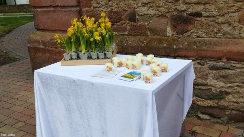 Sie konnten dort einen besonderen Gruß der Kirchengemeinde mitnehmen: kleine Osterglocken aus der Knolle, ein Kartengruß, eine kleine Osterkerze und eine Predigt von Pfarrer Till Martin Wisseler.