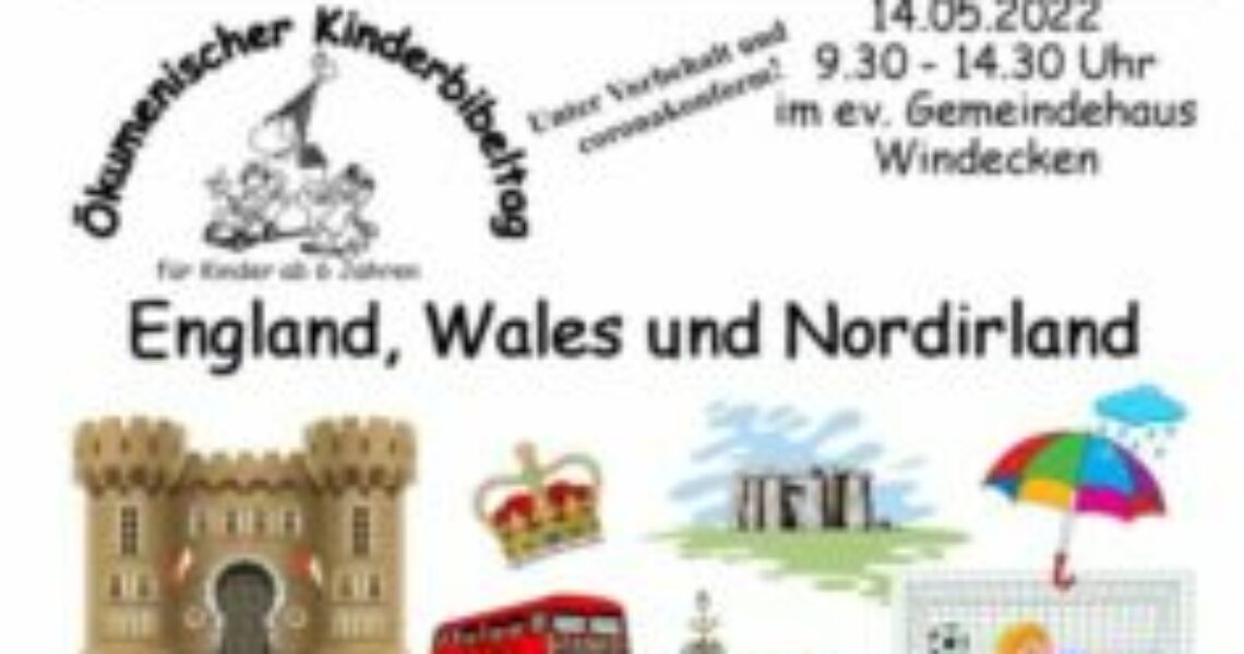 Wir laden ein zum nächsten Kinderbibeltag. Passend zum diesjährigen Weltgebetstag wollen wir mit euch gemeinsam England, Wales und Nordirland kennenlernen. Natürlich gibt es wieder Spiele, Geschichten, Basteleien und ein passendes Essen. Hier geht es zum Anmeldeformular.