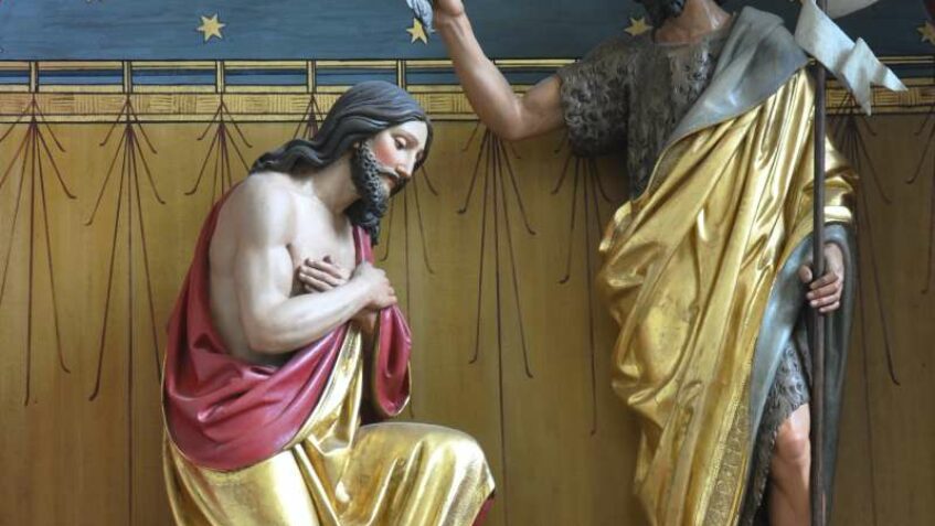 Das Markusevangelium, das die Geschichten um Weihnachten nicht kennt, beginnt mit diesem Vorbereiter, mit Johannes dem Täufer. Er trat auf und taufte die Menschen am Jordan, zur Vergebung der Sünden, wie es heißt. Und dann taufte er auch Jesus (siehe das Bild oben), womit dessen Weg zu den Menschen begann.